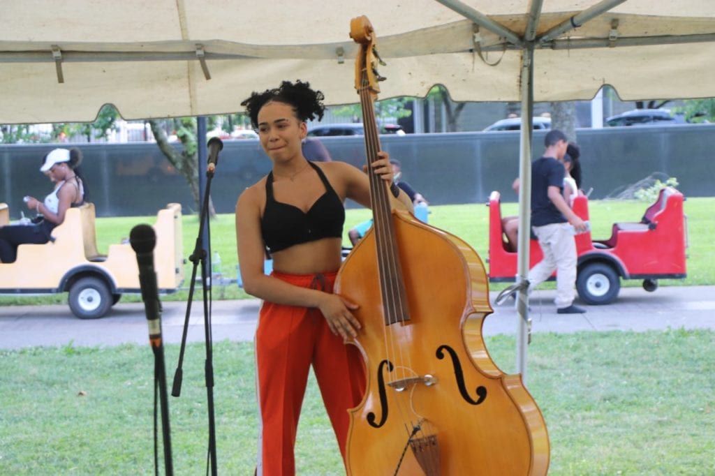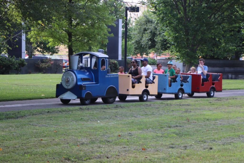 NASHVILLE, TN — Kids bounced inside the inflatable playhouse and a couple of boys threw a football in the grass at Bi-Centennial Mall Saturday afternoon. High school senior Bella Dotson played the Haitian Fight Song on her stand-up bass. A train trolley with a blue engine painted like the Little Engine That Could took people around the mall.