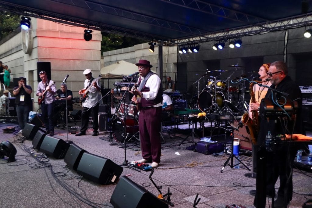 The tune is standard 12-bar blues and the lyrics are more ironic than pitiful. Waters talked a bit to the audience about getting his first guitar at age 12 and watching the sun set on so many heroin addicts he once knew. He thanks God, music, and spaghetti for his salvation in that order. At 64, Waters has an unlined face and could be Australian. He’s got no worries because he puts his faith in the Lord.