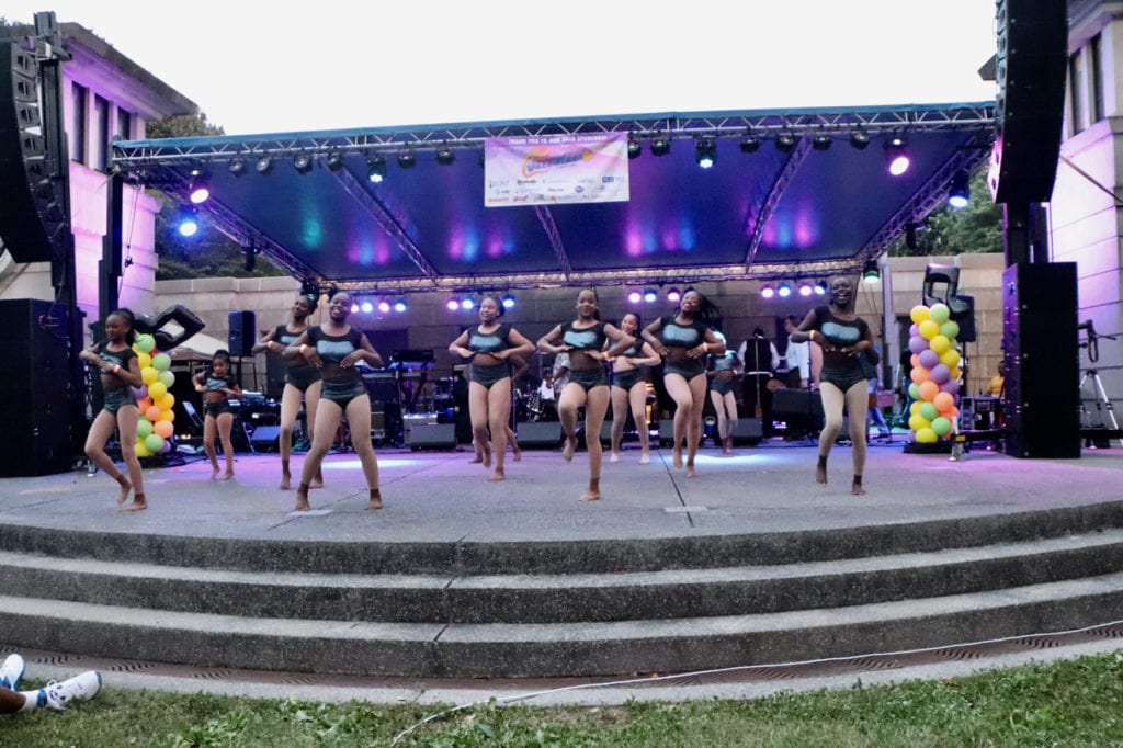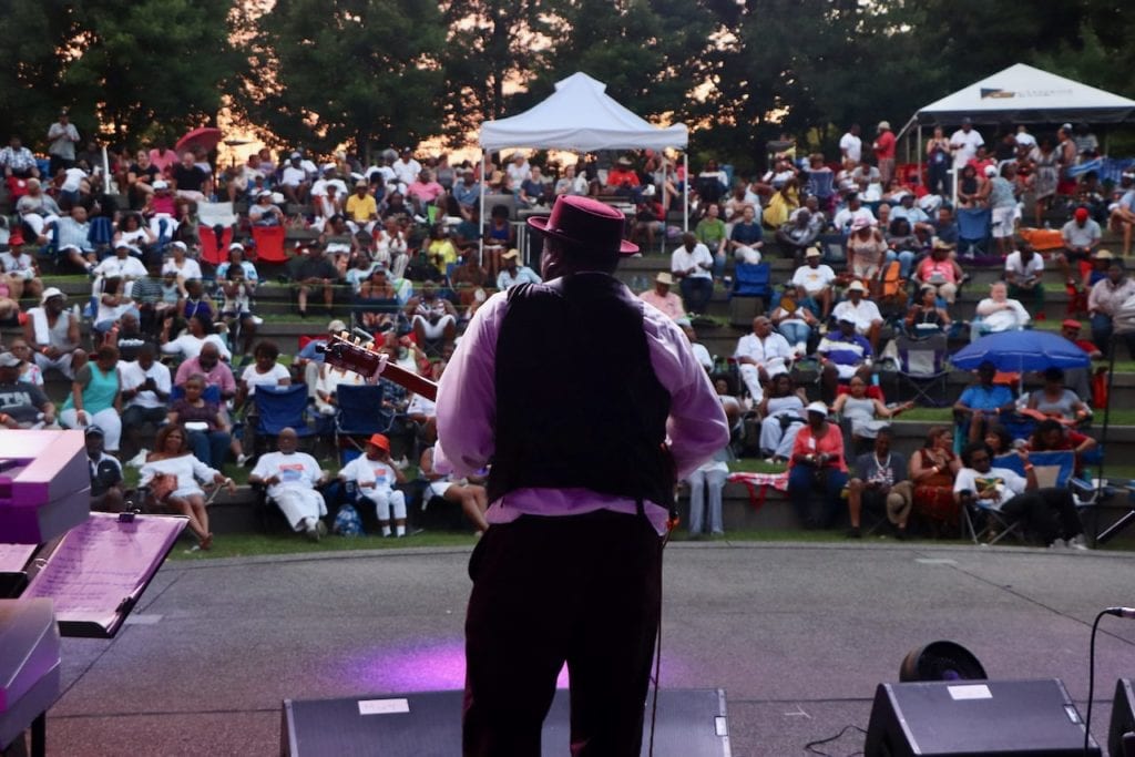 lawn chairs with umbrellas in the amphitheater. The Total Eclipse Band and Gale Mayes played first and Richard Waters and the Sweetwaters Band took the stage around 6:30. They were followed by a girls dance troupe, the Jewels of Distinction.
