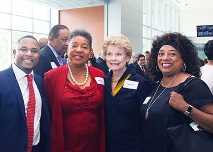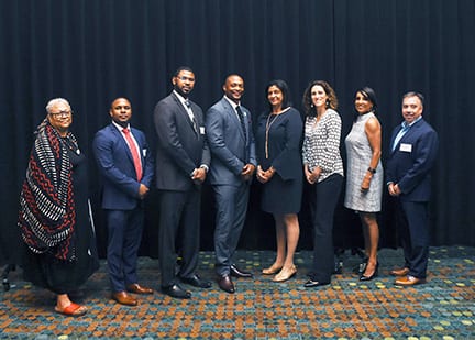Honoree Gail Williams (fifth from left) poses with panelists l-r; Rev. Dr. Emilie M Townes, Robert Sherrill, Shan Foster, Eddie George, Stephanie White, Emcee Vicki Yates, and Sean Henry.