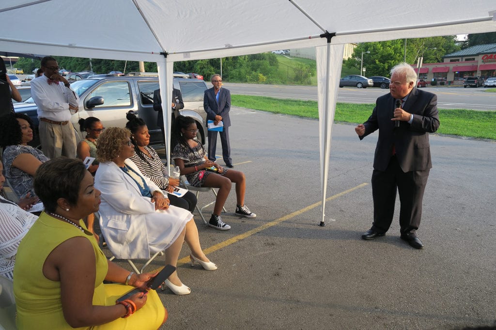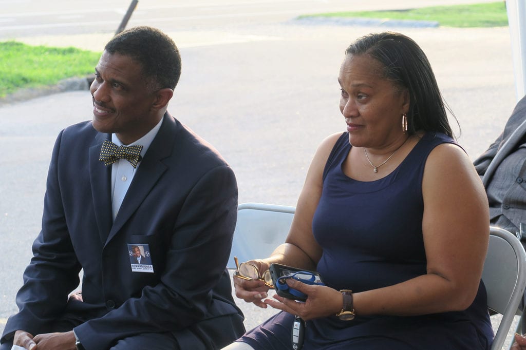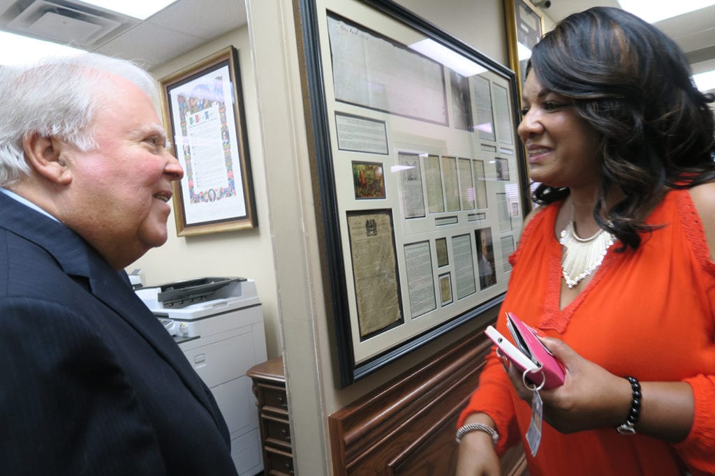 l-r; Attorney Elliott Ozment stands with Candidate Howard Jones during a Celebration Reception at Ozment Law Firm. Ozment has an outstanding collection of artifacts about the significant movements in this country, ranging from the death of Emmitt Till in Mississippi to the Ceasar Chevez migrant workers uprising in California. All photos by Joyce Perkins