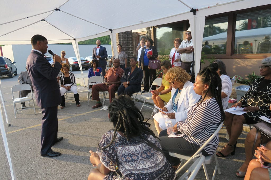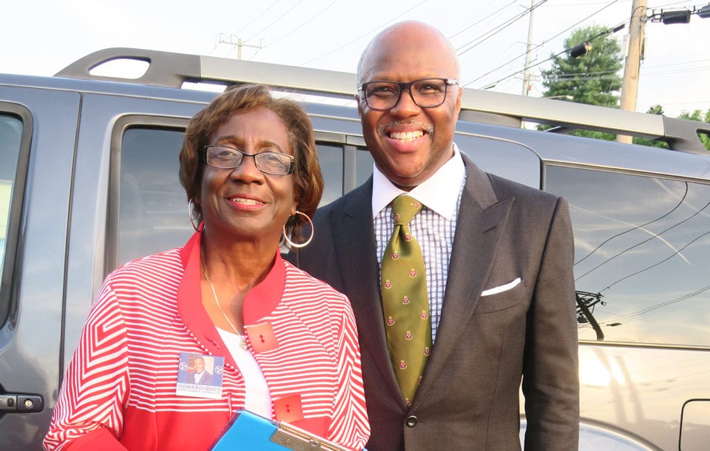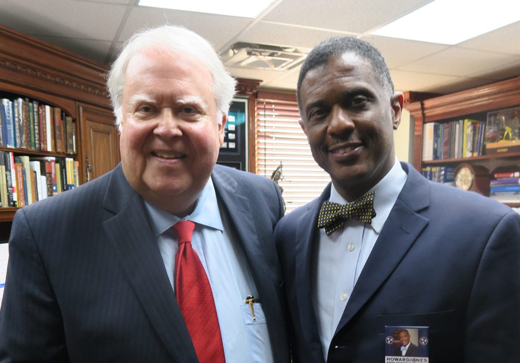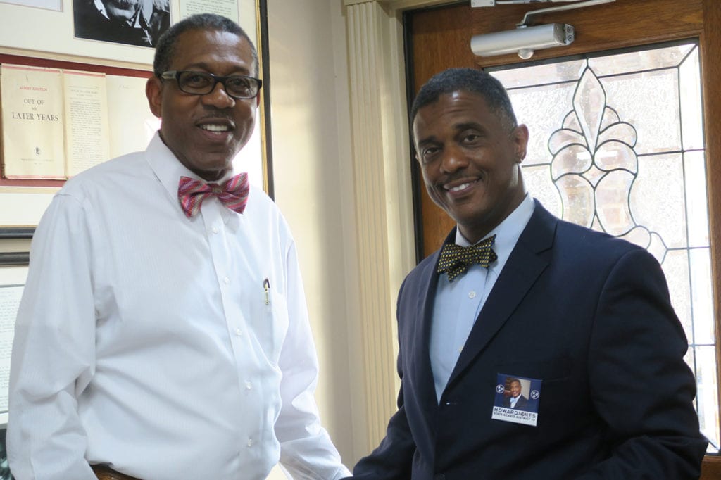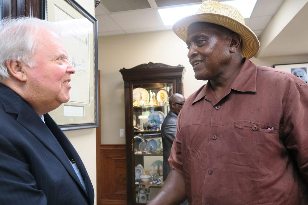 l-r; Attorney Elliott Ozment stands with Candidate Howard Jones during a Celebration Reception at Ozment Law Firm. Ozment has an outstanding collection of artifacts about the significant movements in this country, ranging from the death of Emmitt Till in Mississippi to the Ceasar Chevez migrant workers uprising in California. All photos by Joyce Perkins