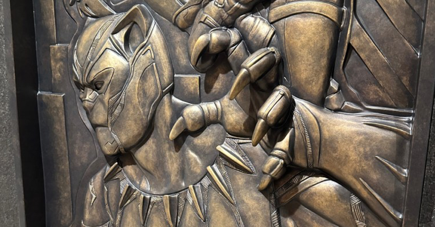 T’Challa, the Black Panther, King of Wakanda. The statue looms large over any other character depictions on the ship. He is standing with his shoulders back, his fist balled up, ready for battle if necessary. At his feet is a panther in mid-stride, equally ready to pounce if that’s what the situation calls for. The statue is beautiful. It is also overwhelmingly brilliant.