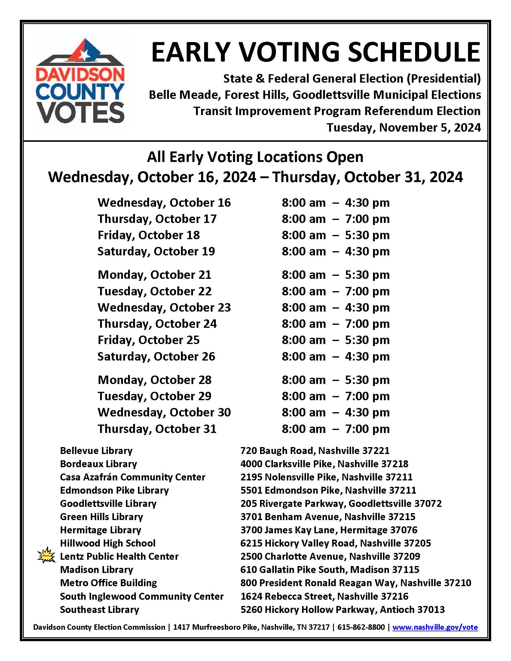 For more information, contact the Davidson County Election Commission, 8 a.m.-4:30 p.m., Monday through Friday by phone at (615) 862-8800, by email at vote.questions@nashville.gov, or visit the website at www.nashville.gov/departments/elections.