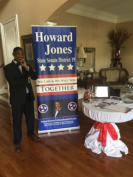 Candidate Jones stands boldly by the pull-up advocating his candidancy.