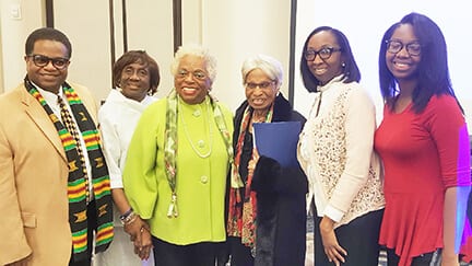 Members of the AME congregation congratulate Dr. Jamye Coleman Williams for her outstanding presentation and her award. They include Joe Turner, Phyllis Qualls, Novella Page, Dr. Jamye Coleman Williams, Tonya Lowe and daughter Payton Lowe.