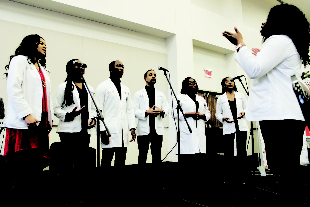 During breakfast, the Meharry Gospel Choir provided musical selections, with the assistance of Meharry’s executive vice president, Dr. Peter E. Millet, on bass guitar. Attendees also participated in a touching red dress stroll, a Zumba activity and learned some simple yoga poses to do at their desks. Rev. Robin Kimbrough, Meharry’s chaplain, provided the invocation and benediction. “Let our hearts be the sanctuary,” she said.