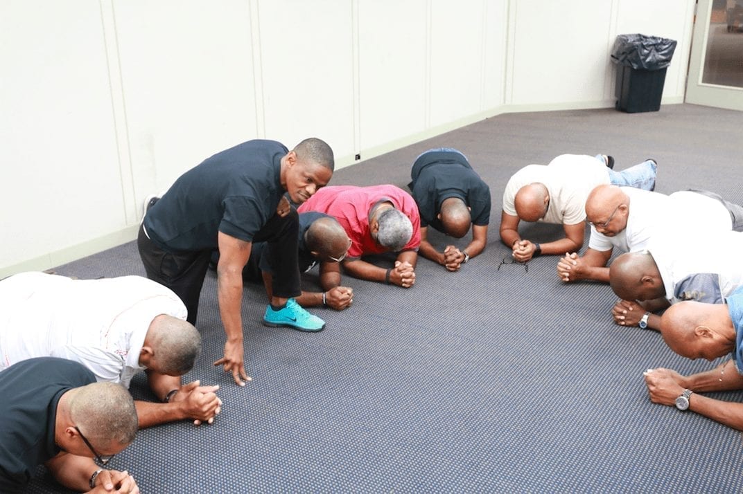 The fitness session included the men completing a motivational huddle and plank challenge. Photos By: Walter Jones
