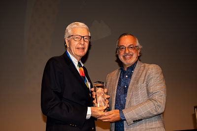 Dr. Donald S. Wood, President and CEO, MDA; MDA Honoree, former Tennessee Titans player Tim Shaw with trophy presentation.