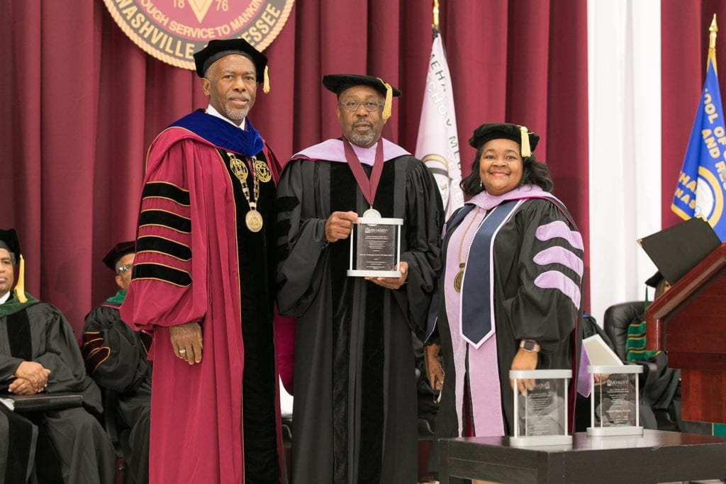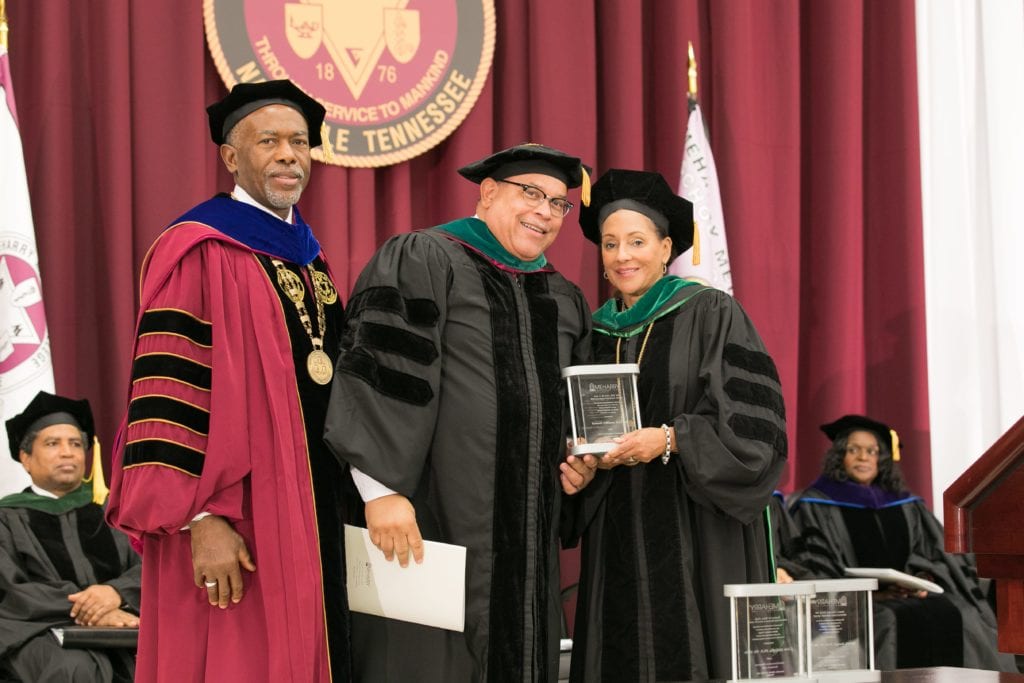 Awards were presented to distinguished Meharry alumni at the Convocation, one from each of the college’s three schools. The Axel C. Hansen, M.D. ’44 Distinguished Physician Award from the School of Medicine was presented to Kenneth Williams, M.D. ’86 whose Mississippi practice and business and community efforts resulted in the saving of a community hospital. Dr. Williams is a fourth-generation Meharrian. “I’m not standing by myself,” he said. “There are a lot of ghosts that are along with me that are glad to see someone in my family receive this.”