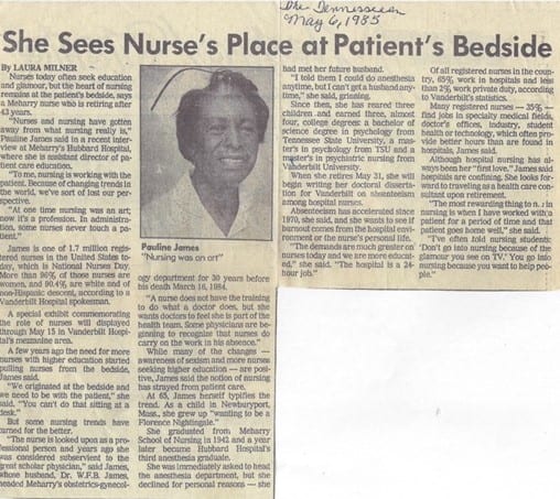 In 1943, she married the late Dr. W. F. Bernell James, a noted surgeon, and Professor and Chairman of the Department of Obstetrics and Gynecology at Meharry for over 20 years. Pauline became the Ob-Gyn Head Nurse, Director of Nursing Service and Assistant Director of Patient Care Education. They had three children together; Bernell Jr., now-deceased; Paula, a noted jazz vocalist and former Metro Nashville Public Schools instructor, and Norma, a retired U.S. Army Colonel.