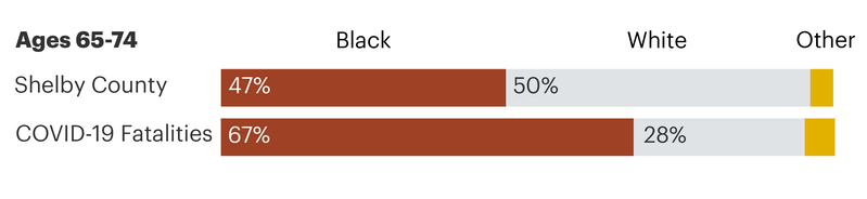 The pandemic is expected to lower life expectancies nationwide, which will only exacerbate the Black-white life-expectancy gap. Before the pandemic, Black residents of Shelby County, on average, were expected to live to be 73 years and four months old, compared to 78 years and one month for white residents. What that means is that while 54% of the county’s residents are Black, Black people account for only 39% of residents 75 and up.