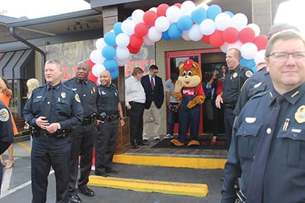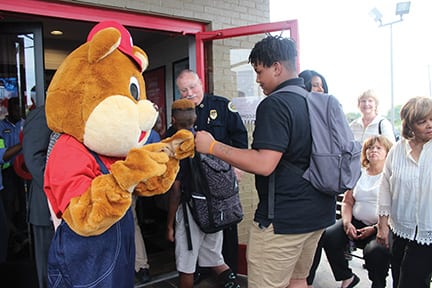 Awaiting the students entrance into Shoney’s are l-r; Deputy Chief Todd Henry, Deputy Chief John Drake, Sgt. Jonathan Marklein and Deputy Chief Damian Huggins and Shoney Bear.