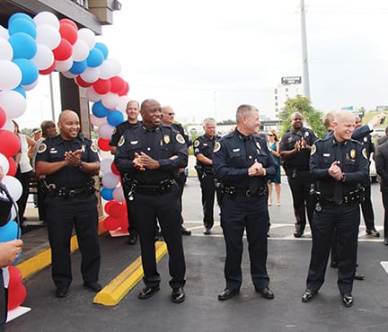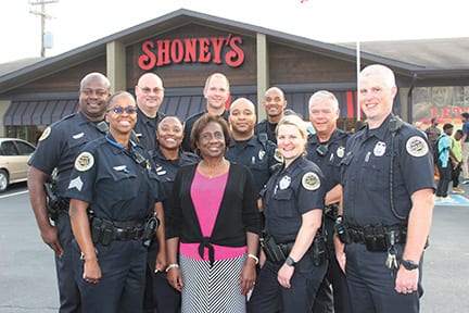 l-r; Eric Cleveland, Corporate Executive Chef and Director of Culinary Innovation; Sgt. David Windus; Lt. Jason Proctor; Captain David Corman; Sgt. Scott Hull; Officer Angela Booker; Ms. June, Tennessee Tribune and TSU; Sgt. Jonathan Marklein; David Davoudpour, Chairman and CEO of Shoney’s; Chief Steve Anderson; Pastor Howard E. Jones, Jr. Assistant Vice Principal, Metro Schools; Juan Gipson, Franchise Business Executive for Shoney’s; and Hope Hines, retired sports director, WTVF NewsChannel 5.