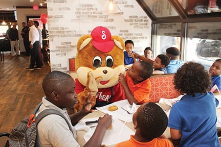 Children from Backfield in Motion enjoy time with Shoney Bear.
