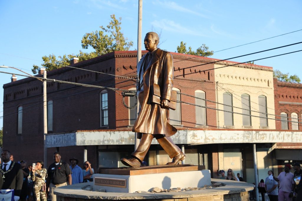 COLUMBIA, TN — An iconic statue of civil rights attorney and Supreme Court Justice Thurgood Marshall was unveiled Friday in Columbia, commemorating his role in defending those charged in what became known as the 1946 Columbia Race Riot — a prelude to the Civil Rights Movement. The unveiling took place at the roundabout on Main Street and East Eighth Street. The statue is a gift from Columbia Peace and Justice Initiative (CPJI) to the City of Columbia.