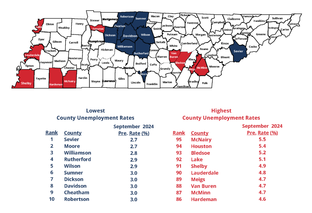 NASHVILLE – Ninety-one of Tennessee’s 95 counties reported unemployment rates below 5% in September even as most counties saw an uptick in their rates over the previous month, according to data from the Tennessee Department of Labor and Workforce Development (TDLWD).