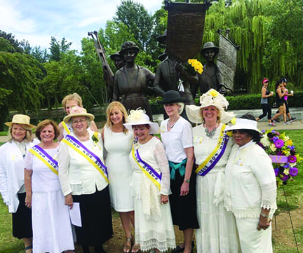 l-r; Jackie Hillman,TWSM Board of Directors, Adrienne Pakis-Gillon, TWSM VP , (Hon. Sue Shelton White), Alma Sanford, TWSM Secretary, (Hon. Carrie Chapmen Catt), Hon. Megan Barry, Mayor of Nashville, Yvonne Wood, TWSM, President, (Hon. Abby Crawford Milton), Linda Knight, TWSM Board of Directors, Pat Pierce, TWSM Treasurer, (Hon. Anne Dallas Dudley), Rosetta Miller Perry,TWSM Board of Directors, (Hon. Frankie Pierce)