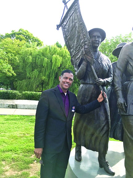 Pastor Howard E. Jones, Jr., candidate for State Senate, District 19 stands with statue of Frankie Pierce (member of First Baptist Church Capitol Hill).