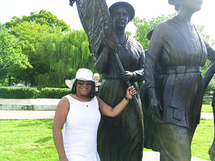 Brenda Wynn, Davidson County Clerk stands with statue of Frankie Pierce (member of First Baptist Church Capitol Hill).