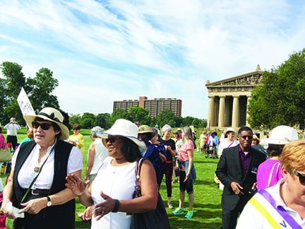 Pastor Howard Jones (far right) marches with women honoring Tennessee Suffragists-Women’s Equality Day Celebration Women’s right to Vote. The Women marched from the Parthenon to the Suffrage Monument in Centennial Park. Shown far left is Barbara Clinton with Brenda Wynn, Davidson County Clerk.